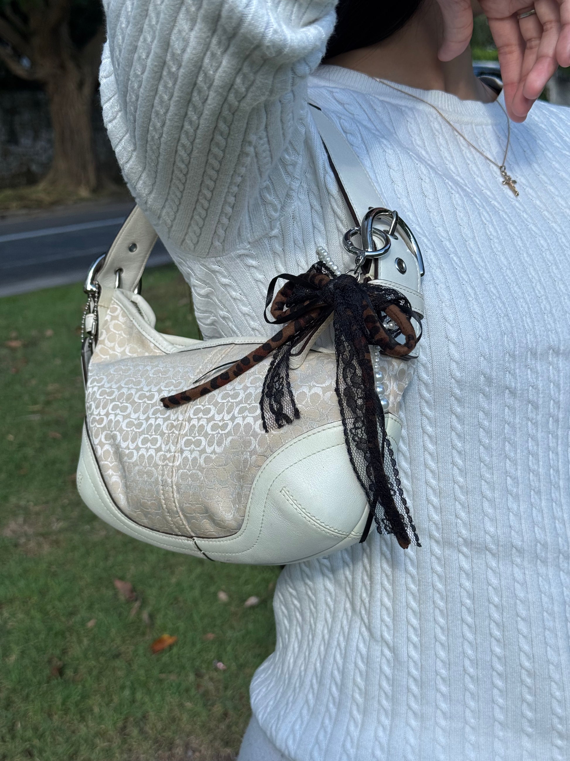 Vintage cream coach with leather detailings, signature C monogram pattern & branded coach keychain. A timeless staple from Coach’s early 2000s archive.